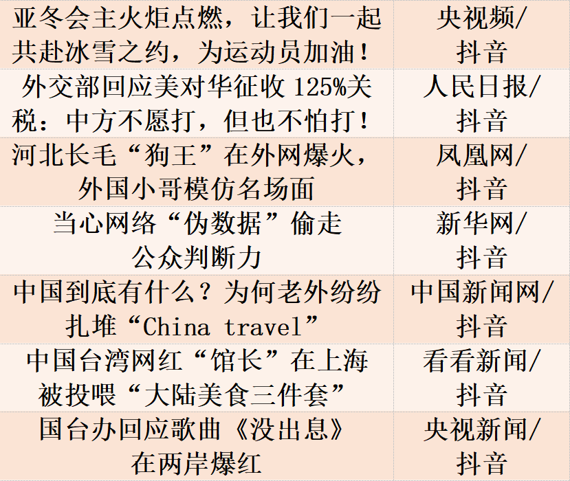 2025年,中央广播电视总台《纪念中国人民抗日战争暨世界反法西斯战争胜利80周年大会》全媒体总触达近300亿人次、人民日报“外交部回应美对华征收125%关税:中方不愿打,但也不怕打!”引发海量点赞。哪吒之魔童闹海、东风-5C报道、苏超传播、台湾“馆长”登陆、“甲亢哥”来华直播、“没出息”神曲改编等成为年度吸睛神器。